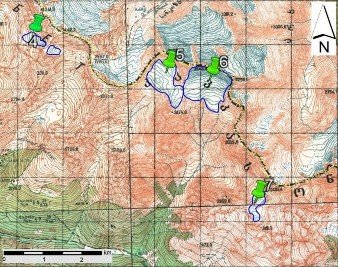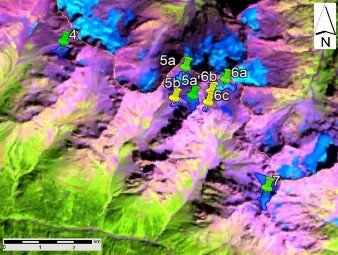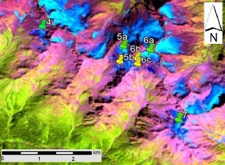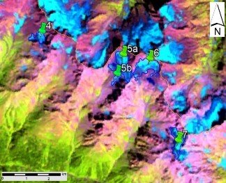 Fig. 2. Contours of glaciers No. 4 (Skeu) − 7 (Bzipi): a − on a topographic map, b − according to the image of the Landsat 7 ETM+ sensor on August 31, 2010, c − according to the image of the Landsat 8 OLI sensor on September 5, 2015, d − according to the image of the Landsat 8 OLI TIRS sensor on September 11, 2020.