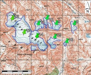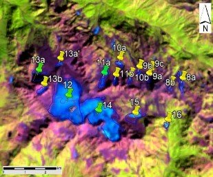 Fig. 3. Contours of glaciers No. 8 (Psikva) − 12 (Khimsa), No. 13 (Kubisha), No. 14 (Kelasuri) − 16: a − on a topographic map, b − according to the Landsat 7 ETM+ sensor image of August 31, 2010, c − according to the Landsat 8 OLI sensor image of September 5, 2015, d − according to the Landsat 8 OLI TIRS sensor image of September 11, 2020.