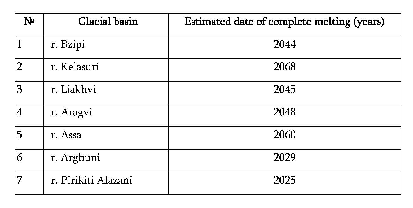 The dynamics of glacier change in the Bzifi and Kelasuri basins The analysis used data from Landsat 5, 7, and 8 satellites for the time interval from 1986 to 2023. Satellite data for fourteen different dates were available for this period. Table 6 shows the total areas of glaciers determined by the SRS by date.