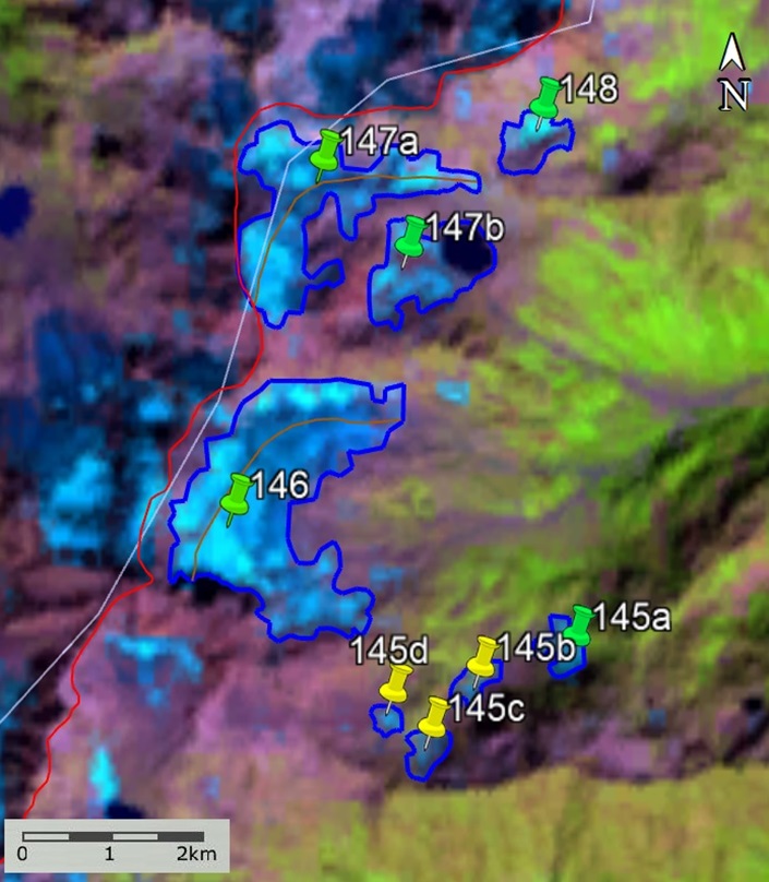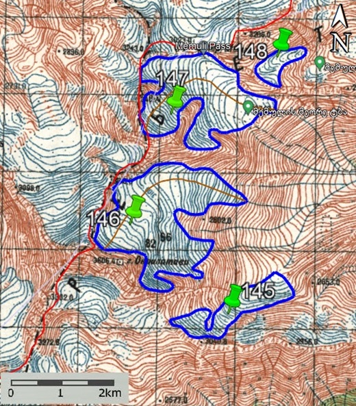 Fig. 4. Contours of glaciers No. 145 (Okrylastavi, 146a), No. 146 (Okrylastavi, 146b) − 148 (Memula): a − according to the topographic map, b − according to the Landsat 7 ETM+ sensor image of August 31, 2010, c − according to the Landsat 8 OLI TIRS sensor image of September 5, 2015, d − according to the Landsat 8 OLI TIRS sensor image of September 11, 2020.