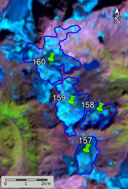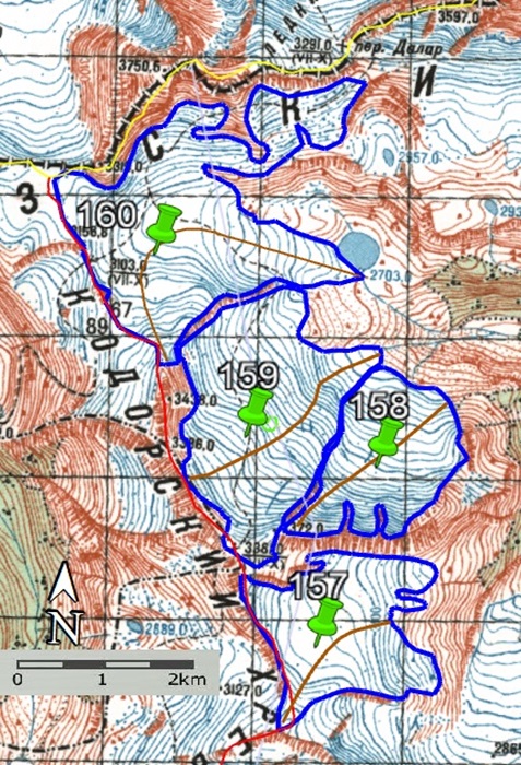 Fig. 6. Contours of glaciers No. 157 − 160: a − according to the topographic map, b − according to the Landsat 7 ETM+ sensor image of August 31, 2010, c − according to the Landsat 8 OLI TIRS sensor image of September 5, 2015, d − according to the Landsat 8 OLI TIRS sensor image of September 11, 2020.