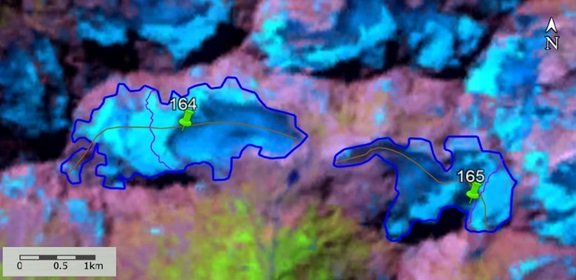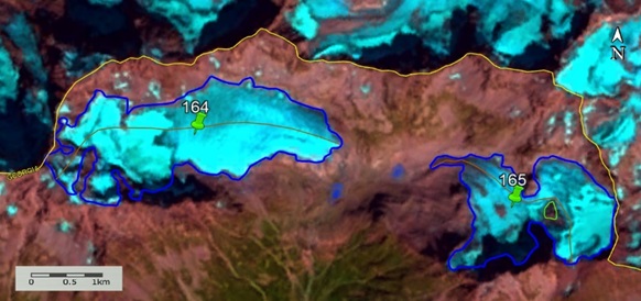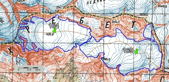 Fig. 8. Contours of glaciers No. 164 and No. 165: a − according to the topographic map, b − according to the Landsat 7 ETM+ sensor image of August 31, 2010, c − according to the Landsat 8 OLI TIRS sensor image of September 5, 2015, d − according to the Landsat 8 OLI TIRS sensor image of September 11, 2020.