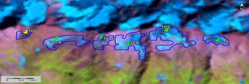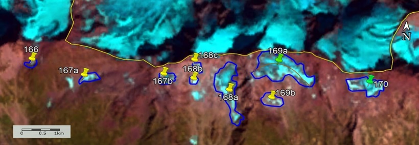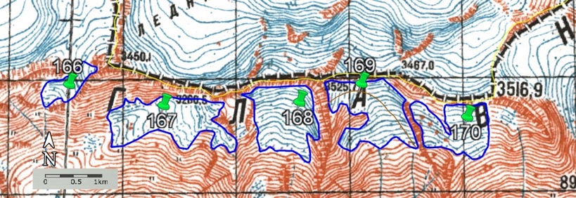 Fig. 9. Contours of glaciers No. 166 – 170: a − according to the topographic map, b − according to the Landsat 7 ETM+ sensor image of August 31, 2010, c − according to the Landsat 8 OLI TIRS sensor image of September 5, 2015, d − according to the Landsat 8 OLI TIRS sensor image of September 11, 2020.