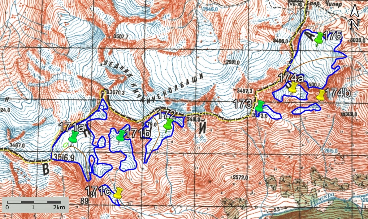 Fig. 10. Contours of glaciers No. 171 – 175: a − according to the topographic map, b − according to the Landsat 7 ETM+ sensor image of August 31, 2010, c − according to the Landsat 8 OLI TIRS sensor image of September 5, 2015, d − according to the Landsat 8 OLI TIRS sensor image of September 11, 2020.