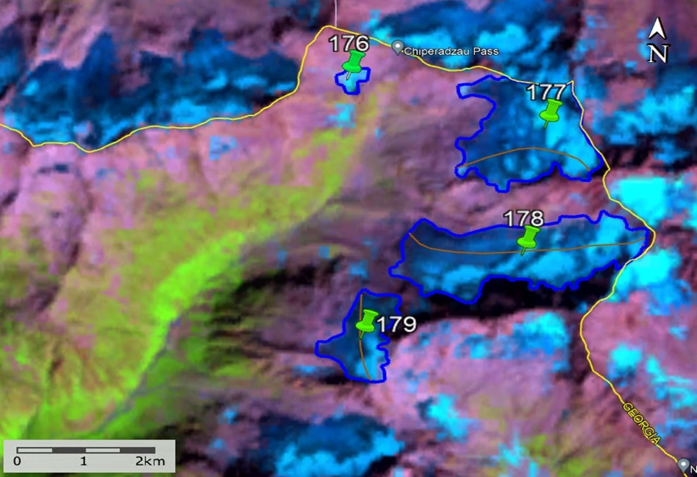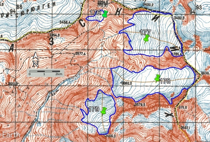 Fig. 11. Contours of glaciers No. 176 − 179: a − according to the topographic map, b − according to the Landsat 7 ETM+ sensor image of August 31, 2010, c − according to the Landsat 8 OLI TIRS sensor image of September 5, 2015, d − according to the Landsat 8 OLI TIRS sensor image of September 11, 2020.