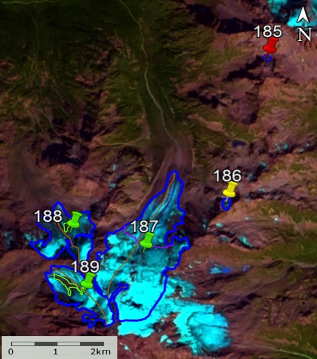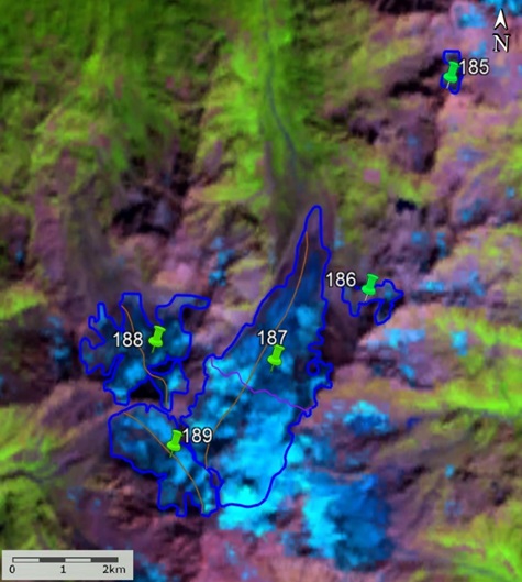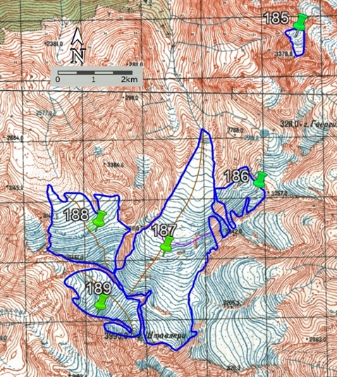 Fig. 14. Contours of glaciers No. 185 − 187 (Shtavleri), No. 188, No. 189: a − according to the topographic map, b − according to the Landsat 7 ETM+ sensor image of August 31, 2010, c − according to the Landsat 8 OLI TIRS sensor image of September 5, 2015, d − according to the Landsat 8 OLI TIRS sensor image of September 11, 2020.