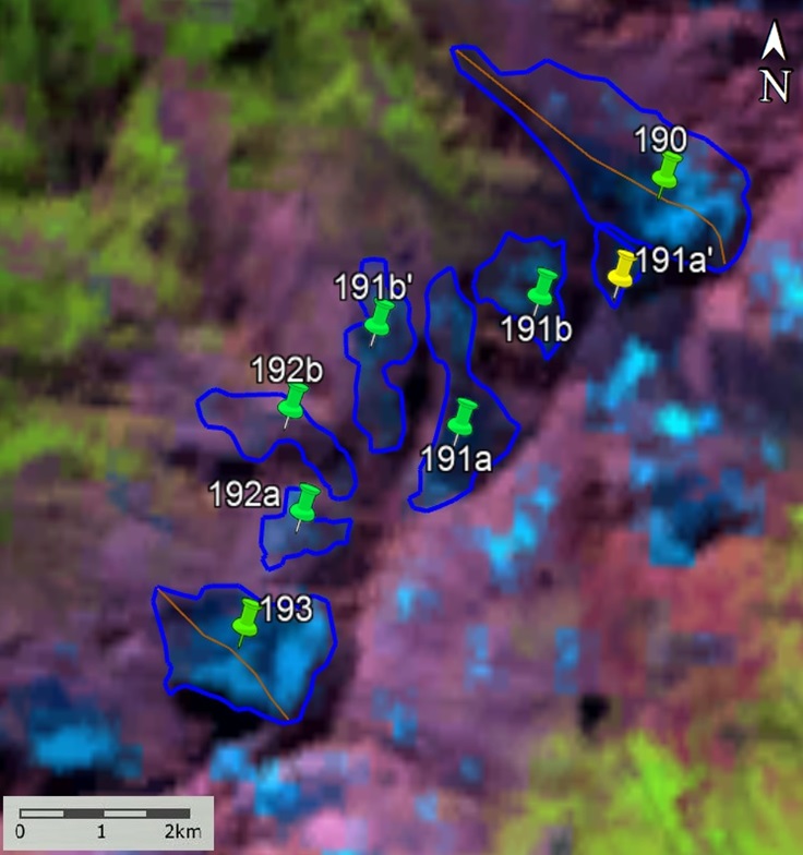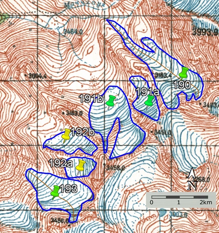Fig. 15. Contours of glaciers No. 190 − 193: a − according to the topographic map, b − according to the Landsat 7 ETM+ sensor image of August 31, 2010, c − according to the Landsat 8 OLI TIRS sensor image of September 5, 2015, d − Landsat 8 According to the image of the OLI TIRS sensor of September 11, 2020.