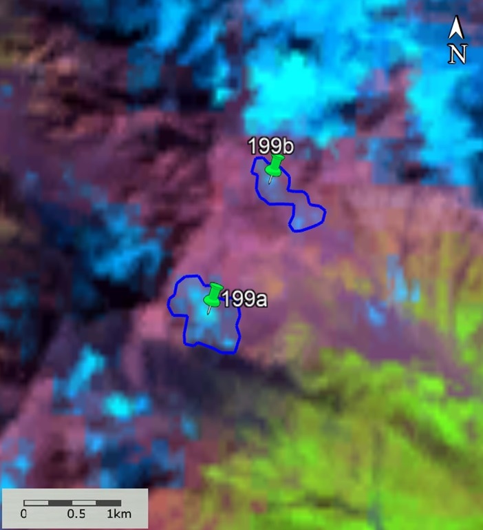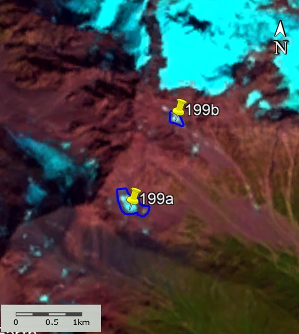 Fig. 19. Contours of glacier No. 199: a − according to the topographic map, b − according to the image of the Landsat 7 ETM+ sensor of August 31, 2010, c − according to the image of the Landsat 8 OLI TIRS sensor of September 5, 2015 According to the image, d − according to the Landsat 8 OLI TIRS sensor image of September 11, 2020.
