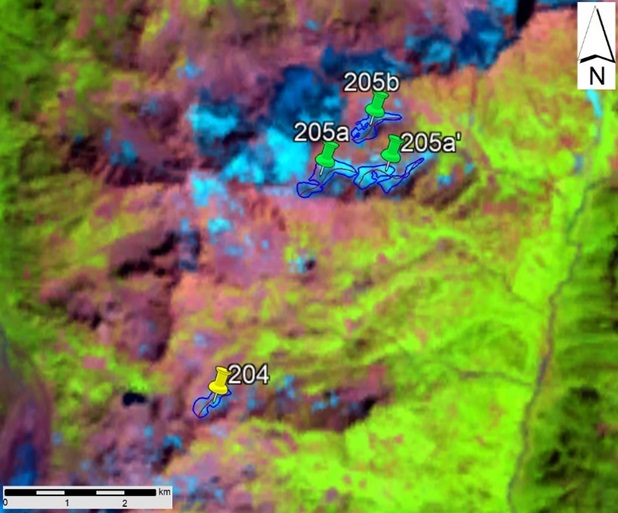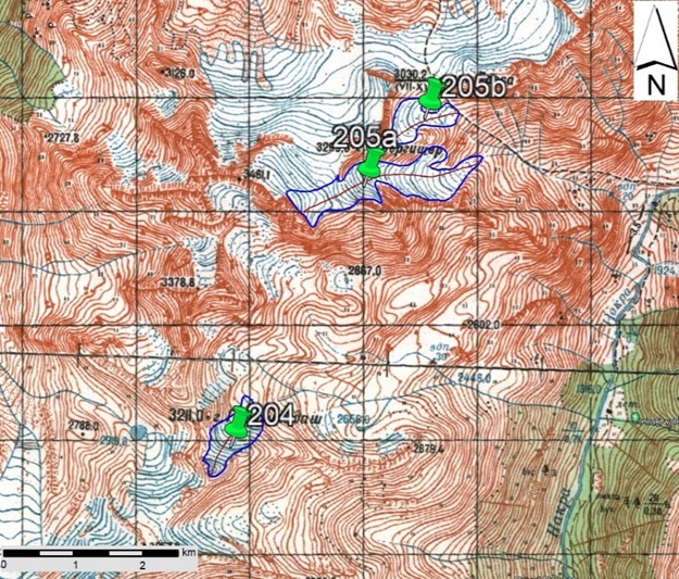 Fig. 22. Contours of glaciers No. 204 (Gvergvildashi) and No. 205 (Gvergisheri): a − according to the topographic map, b − according to the Landsat 7 ETM+ sensor image of August 31, 2010, c − according to the Landsat 8 OLI TIRS sensor image of September 5, 2015, d − according to the Landsat 8 OLI TIRS sensor image of September 11, 2020.