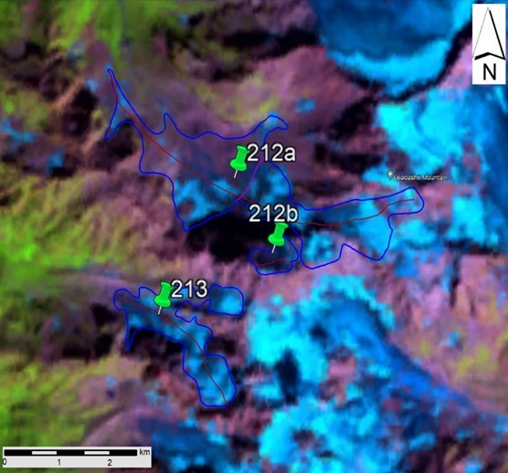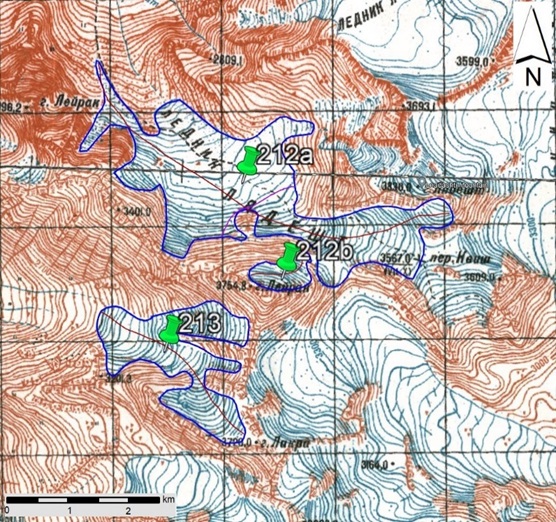 Fig. 25. Contours of glaciers No. 212 (Liadeshti) and No. 213: a − on a topographic map, b − according to the Landsat 7 ETM+ sensor image of August 31, 2010, c − according to the Landsat 8 OLI TIRS sensor image of September 5, 2015, d − according to the Landsat 8 OLI TIRS sensor image of September 11, 2020.