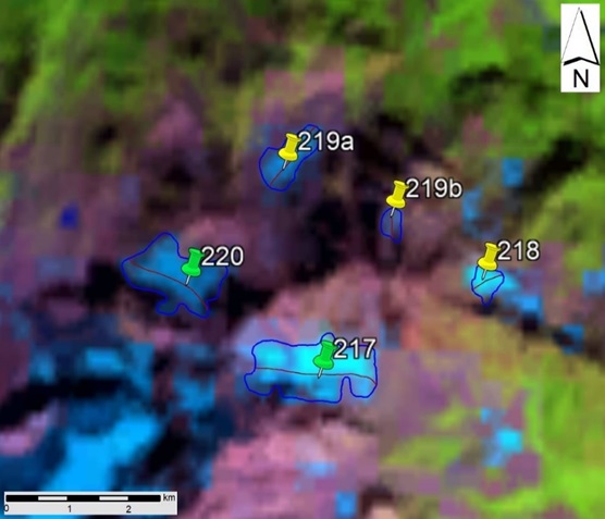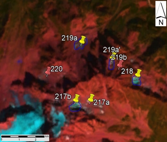 Fig. 27. No. 217 (Tsimzagari), No. 218, No. 219 (North Charinda) and No. 220 (West Charinda) glacier contours: a - according to the topographic map, b - according to the Landsat 7 ETM+ sensor image of August 31, 2010, c - according to the Landsat 8 OLI TIRS sensor image of September 5, 2015, d - according to the Landsat 8 OLI TIRS sensor image of September 11, 2020.