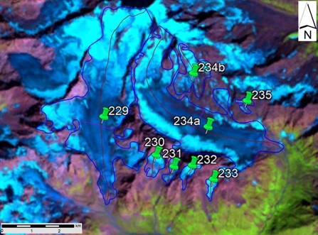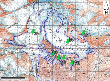 Fig. 30. Contours of glaciers No. 229 (Kvishi) − No. 234 (Dolra) and No. 235 (Goguati): a − according to the topographic map, b − According to the Landsat 7 ETM+ sensor image of August 31, 2010, c − According to the Landsat 8 OLI TIRS sensor image of September 5, 2015, d − According to the Landsat 8 OLI TIRS sensor image of September 11, 2020.
