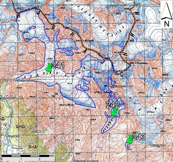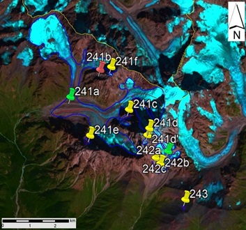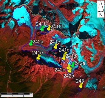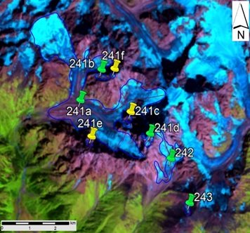 Fig. 32. Glaciers No. 241 (Ushba), No. 242 (Guli) and No. 243 Contours: a − according to the topographic map, b − according to the Landsat 7 ETM+ sensor image of August 31, 2010, c − according to the Landsat 8 OLI TIRS sensor image of September 5, 2015, d − according to the Landsat 8 OLI TIRS sensor image of September 11, 2020.
