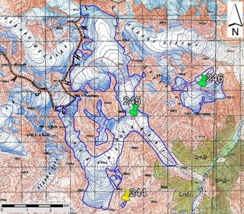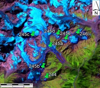 Fig. 33. Contours of glaciers No. 244, No. 245 (Chalaati) and No. 246: a − according to the topographic map, b − according to the Landsat 7 ETM+ sensor image of August 31, 2010, c − according to the Landsat 8 OLI TIRS sensor image of September 5, 2015, d − according to the Landsat 8 OLI TIRS sensor image of September 11, 2020.