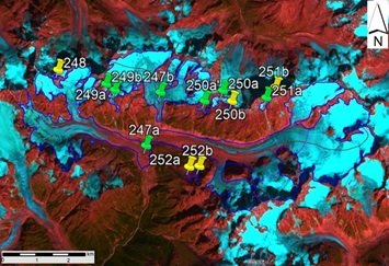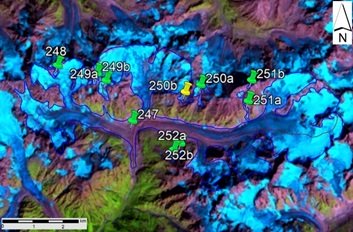 Fig. 34. Contours of glaciers No. 247 − 252: a − according to the topographic map, b − according to the Landsat 7 ETM+ sensor image of August 31, 2010, c − according to the Landsat 8 OLI TIRS sensor image of September 5, 2015, d − according to the Landsat 8 OLI TIRS sensor image of September 11, 2020.