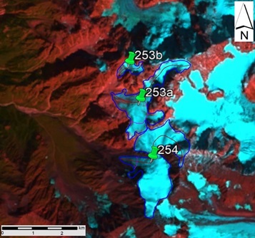Fig. 35. Contours of glaciers No. 253 (Murkvami) and No. 254: a − according to the topographic map, b − according to the Landsat 7 ETM+ sensor image of August 31, 2010, c − according to the Landsat 8 OLI TIRS sensor image of September 5, 2015, d − according to the Landsat 8 OLI TIRS sensor image of September 11, 2020.