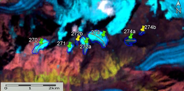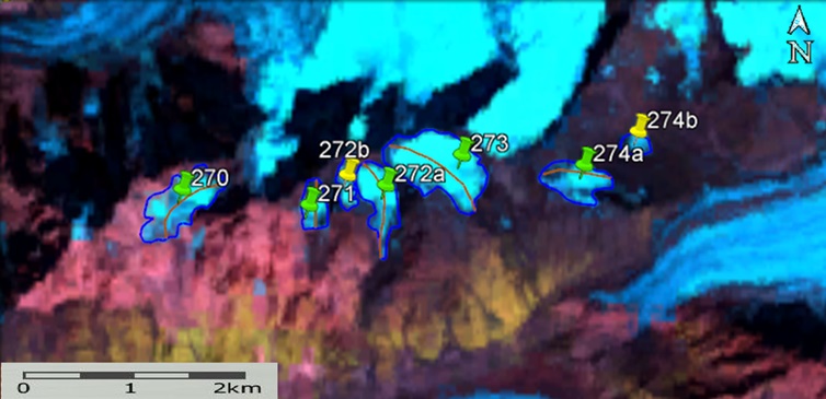 Fig. 39. Contours of glaciers No. 270 - 274: a − according to the topographic map, b − according to the Landsat 5 TM sensor image of September 19, 2011, c − according to the Landsat 8 OLI TIRS sensor image of September 7, 2015, d − according to the Landsat 8 OLI TIRS sensor image of September 11, 2020.