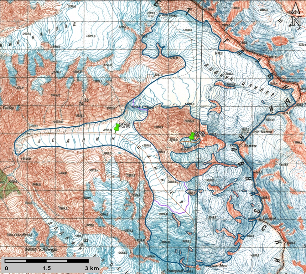 Fig. 40. Contours of glaciers No. 275 (Tsaneri) and No. 276: a − according to the topographic map, b − according to the Landsat 5 TM sensor image of September 19, 2011, c − according to the Landsat 8 OLI TIRS sensor image of September 12, 2017, d − according to the Landsat 8 OLI TIRS sensor image of September 4, 2020.