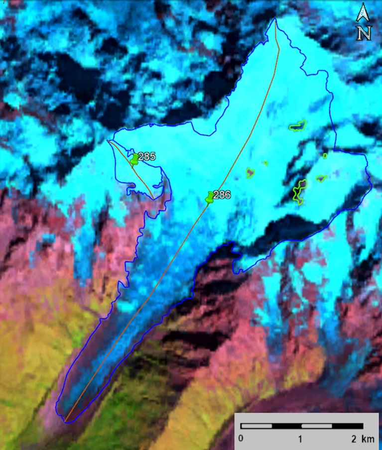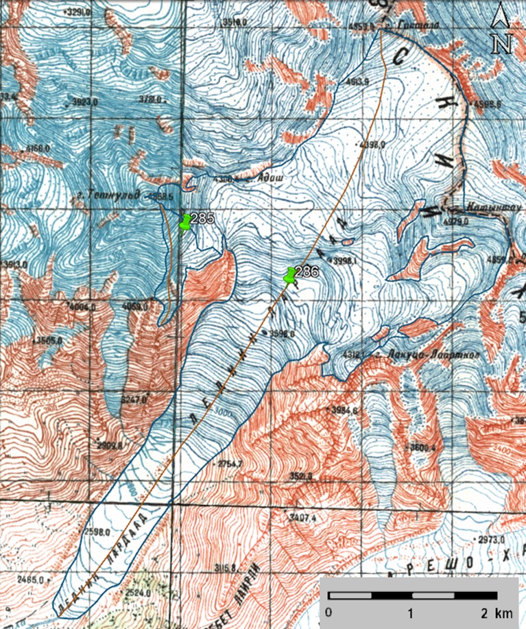 Fig. 42. Contours of glaciers No. 285 and No. 286 (Adishi): a − according to the topographic map, b − according to the Landsat 5 TM sensor image of September 19, 2011, c − according to the Landsat 8 OLI TIRS sensor image of September 12, 2017, d − according to the Landsat 8 OLI TIRS sensor image of September 4, 2020.