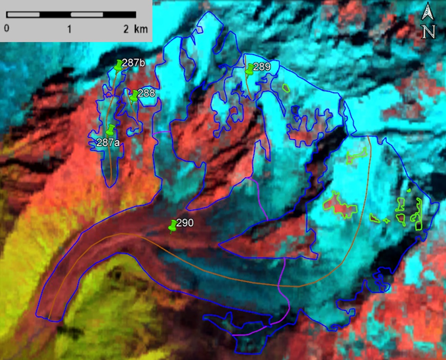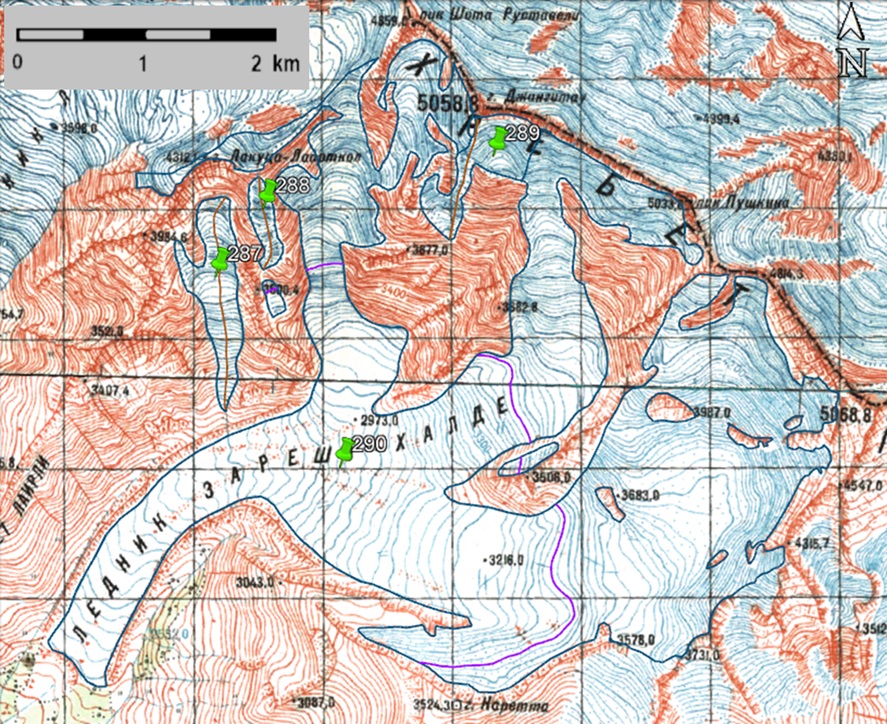 Fig. 43. Contours of glaciers No. 287 − 290 (Khalde): a − according to the topographic map, b − according to the Landsat 5 TM sensor image of August 24, 2010, c − according to the Landsat 8 OLI TIRS sensor image of September 12, 2017, d − according to the Landsat 8 OLI TIRS sensor image of September 20, 2020.