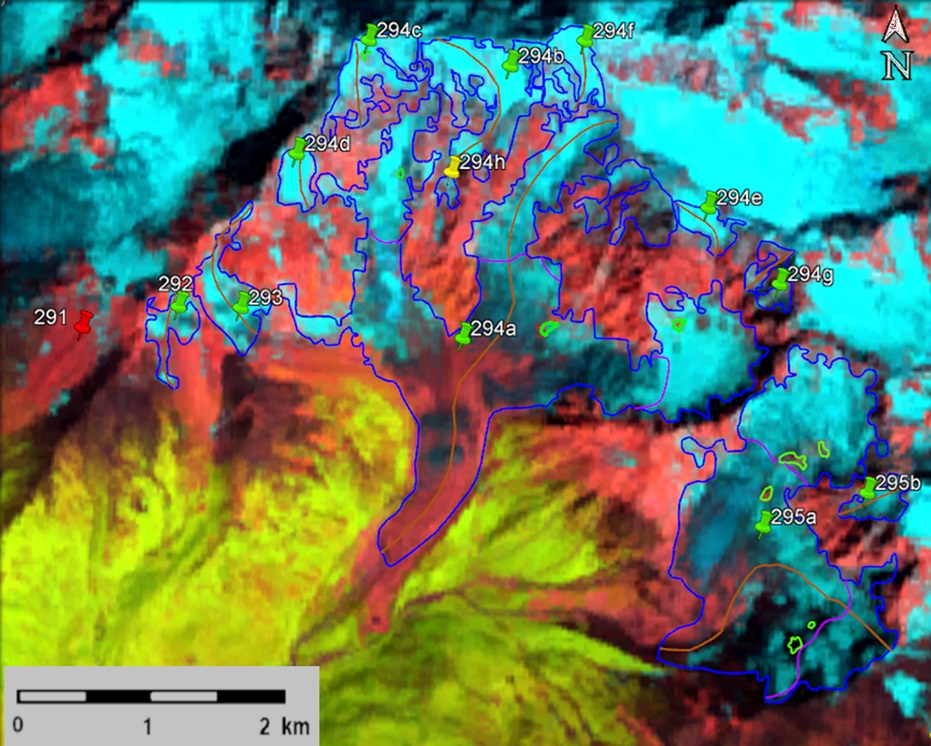 Fig. 44. Contours of glaciers No. 291 (Careta) − 294 (Shkhara) and No. 295 (Namkvami): a − according to the topographic map, b − according to the Landsat 5 TM sensor image of August 24, 2010, c − according to the Landsat 8 OLI TIRS sensor image of September 12, 2017, d − according to the Landsat 8 OLI TIRS sensor image of September 20, 2020.