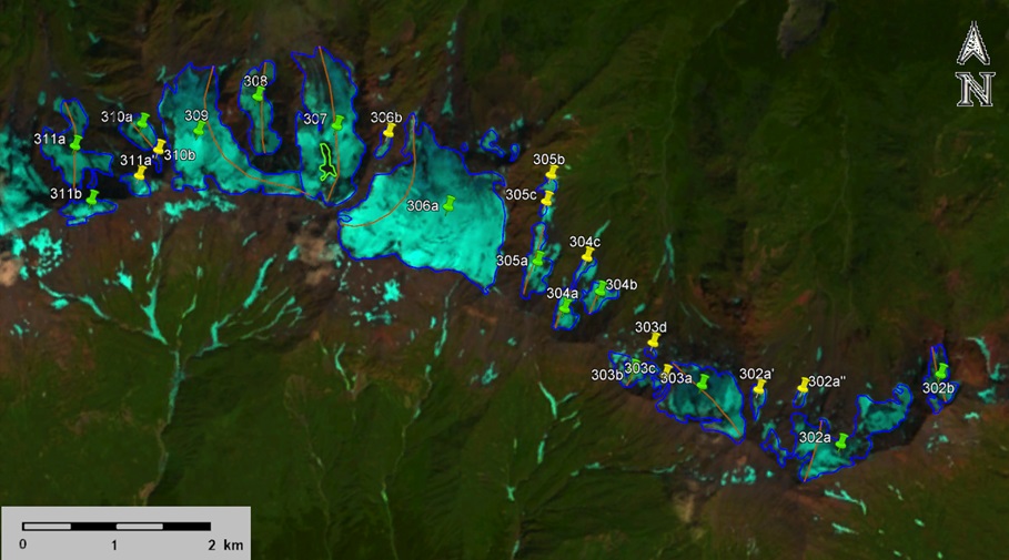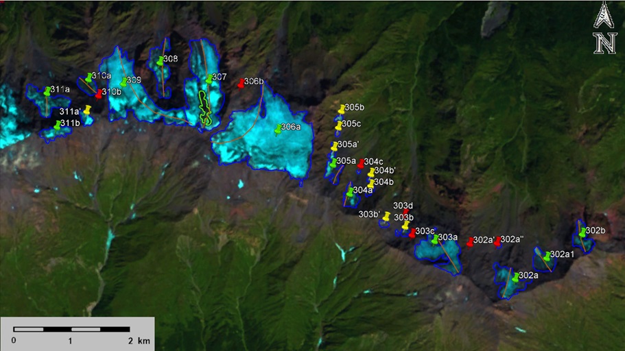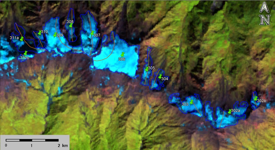 Fig. 46. Contours of glaciers No. 302, No. 303 (Lakhushtadra) − 306 (Khachrula) and No. 307 (Gvadrashi) − 311: a − according to the topographic map, b − according to the Landsat 5 TM sensor image of September 19, 2011, c − according to the Landsat 8 OLI TIRS sensor image of August 24, 2016, d − according to the Landsat 8 OLI TIRS sensor image of September 4, 2020.