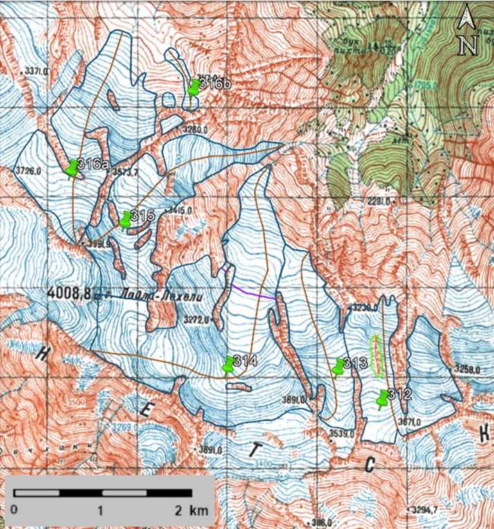 Fig. 47. Contours of glaciers No. 312 - 314 (Laila a), No. 315 (cent. Laila b) and No. 316: a − according to the topographic map, b − according to the Landsat 5 TM sensor image of September 19, 2011, c − according to the Landsat 8 OLI TIRS sensor image of September 12, 2017, d − according to the Landsat 8 OLI TIRS sensor image of September 4, 2020.