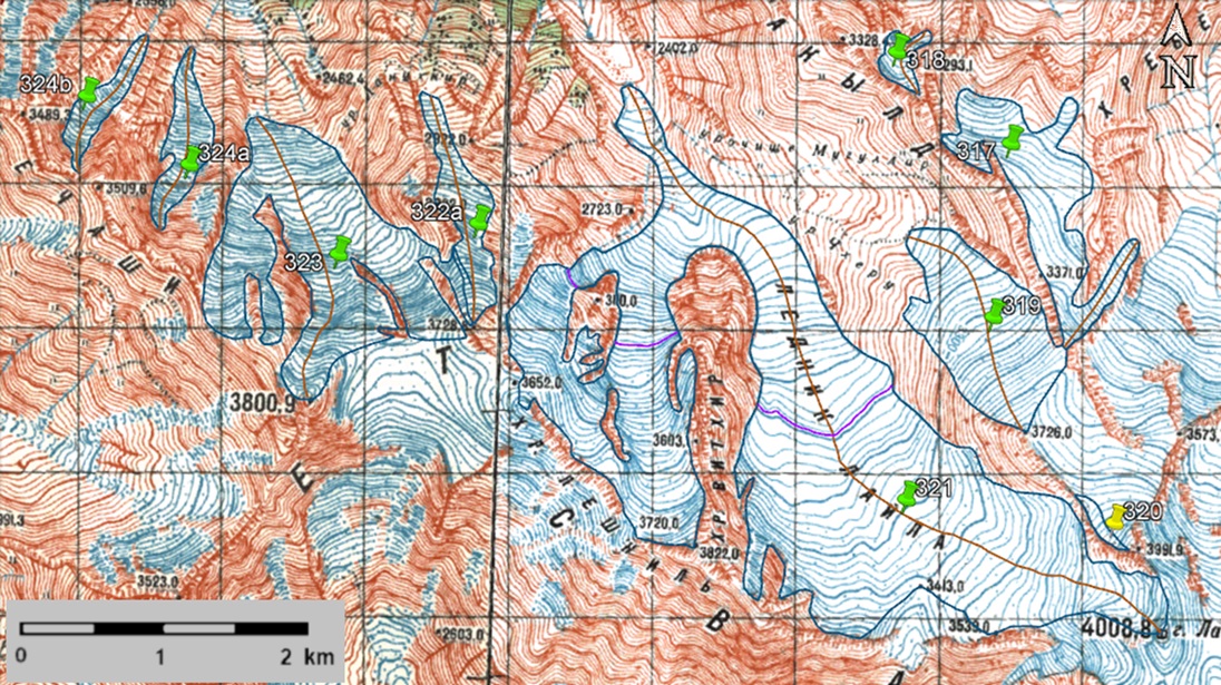 Fig. 48. Contours of glaciers No. 317 − 321 (Laila c) and No. 322 − 324: a − according to the topographic map, b − according to the Landsat 5 TM sensor image of September 19, 2011, c − according to the Landsat 8 OLI TIRS sensor image of September 12, 2017, d − according to the Landsat 8 OLI TIRS sensor image of September 11, 2020.