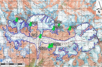 სურ. 34. №247 − 252 მყინვარების კონტურები: ა − ტოპოგრაფიული რუკის მიხედვით, ბ − Landsat 7 ETM+ სენსორის 2010 წლის 31 აგვისტოს სურათის მიხედვით, გ − Landsat 8 OLI TIRS სენსორის 2015 წლის 5 სექტემბრის სურათის მიხედვით, დ − Landsat 8 OLI TIRS სენსორის 2020 წლის 11 სექტემბრის სურათის მიხედვით.
