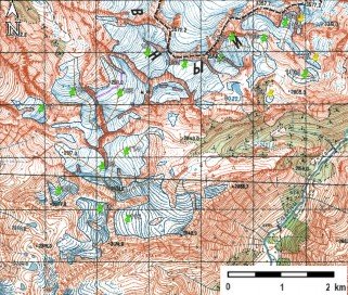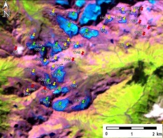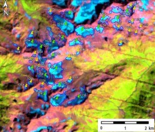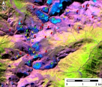 Fig. 14. Contours of glaciers No. 101, No. 102 (Gvandra) − No. 107, No. 113 − 116: a − on a topographic map, b − according to the Landsat 7 ETM+ sensor image of September 11, 2010, c − according to the Landsat 7 ETM+ sensor image of September 6, 2015, d − according to the Landsat 8 OLI TIRS sensor image of September 11, 2020.