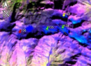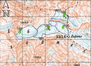 Fig. 18. Contours of glaciers No. 133, No. 134 (Khajali) − 136: a − on a topographic map, b − according to the Landsat 7 ETM+ sensor image of 2010, September 11, c − according to the Landsat 7 ETM+ sensor image of 2015, September 6, d − according to the Landsat 8 OLI TIRS sensor image of September 11, 2020.