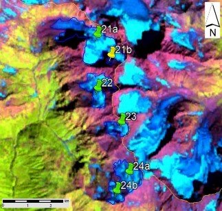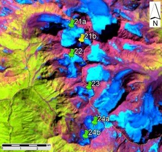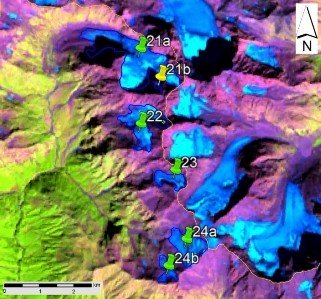 Fig. 3. Contours of glaciers No. 21 (Marukhi) − 24: a − on a topographic map, b − according to the Landsat 7 ETM+ sensor image of August 31, 2010, c − according to the Landsat 8 OLI sensor image of September 5, 2015, d − according to the Landsat 8 OLI TIRS sensor image of September 11, 2020.