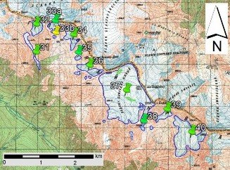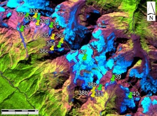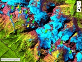 Fig. 5. Contours of glaciers No. 31 − 37 (Samkh. Sopruju), No. 38 − 40 (Adeba): a − on a topographic map, b − according to the image of the Landsat 7 ETM+ sensor on August 31, 2010, c − according to the image of the Landsat 8 OLI sensor on September 5, 2015, d − according to the image of the Landsat 8 OLI TIRS sensor on September 11, 2020.