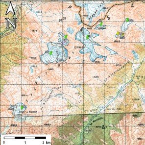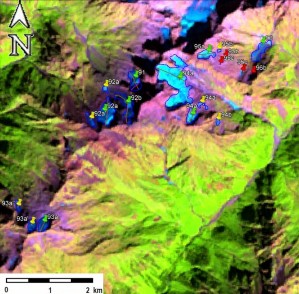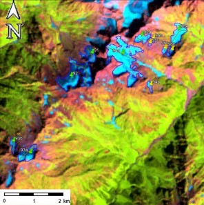 Fig. 12. Contours of glaciers No. 91 (Nakhari) − 93 (Namshikhi), No. 94 − 96: a − on a topographic map, b − according to the Landsat 7 ETM+ sensor image of September 11, 2010, c − according to the Landsat 7 ETM+ sensor image of September 6, 2015, d − according to the Landsat 8 OLI TIRS sensor image of September 11, 2020.