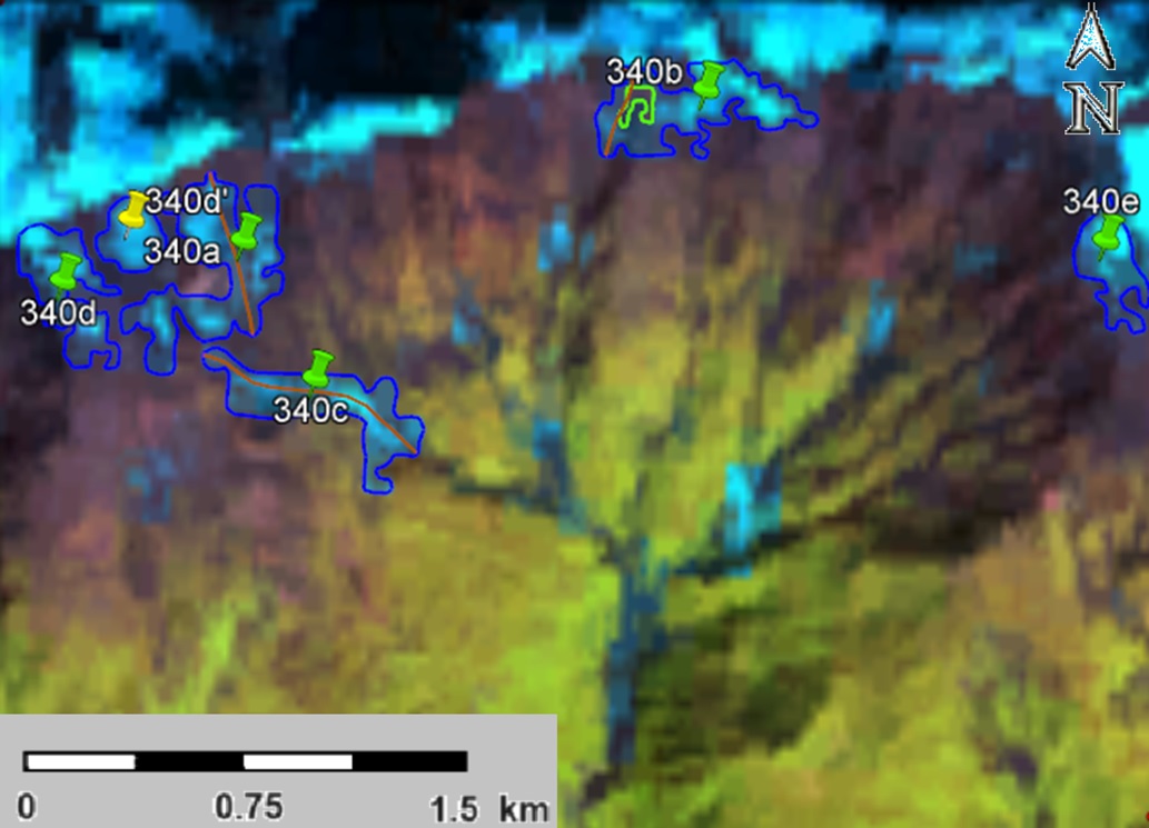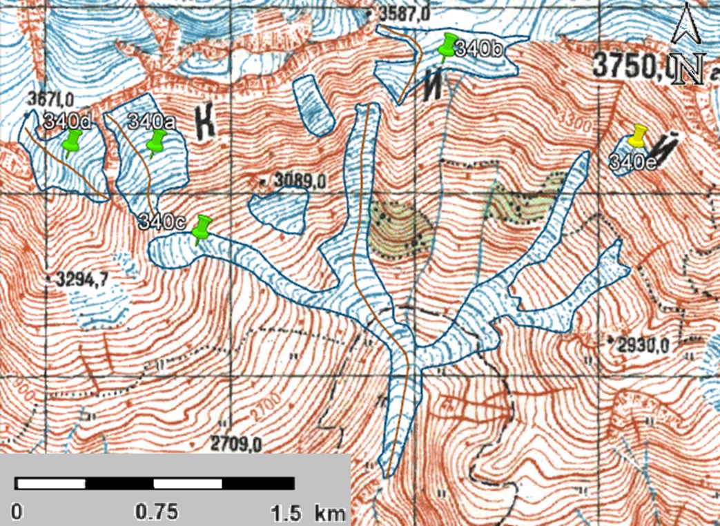 Fig. 5. Contours of glacier No. 340: a ā according to the topographic map, b ā according to the Landsat 5 TM sensor image of September 19, 2011, cā according to the Landsat 8 OLI TIRS sensor image of September 12, 2017, d ā according to the Landsat 8 OLI TIRS sensor image of September 11, 2020.