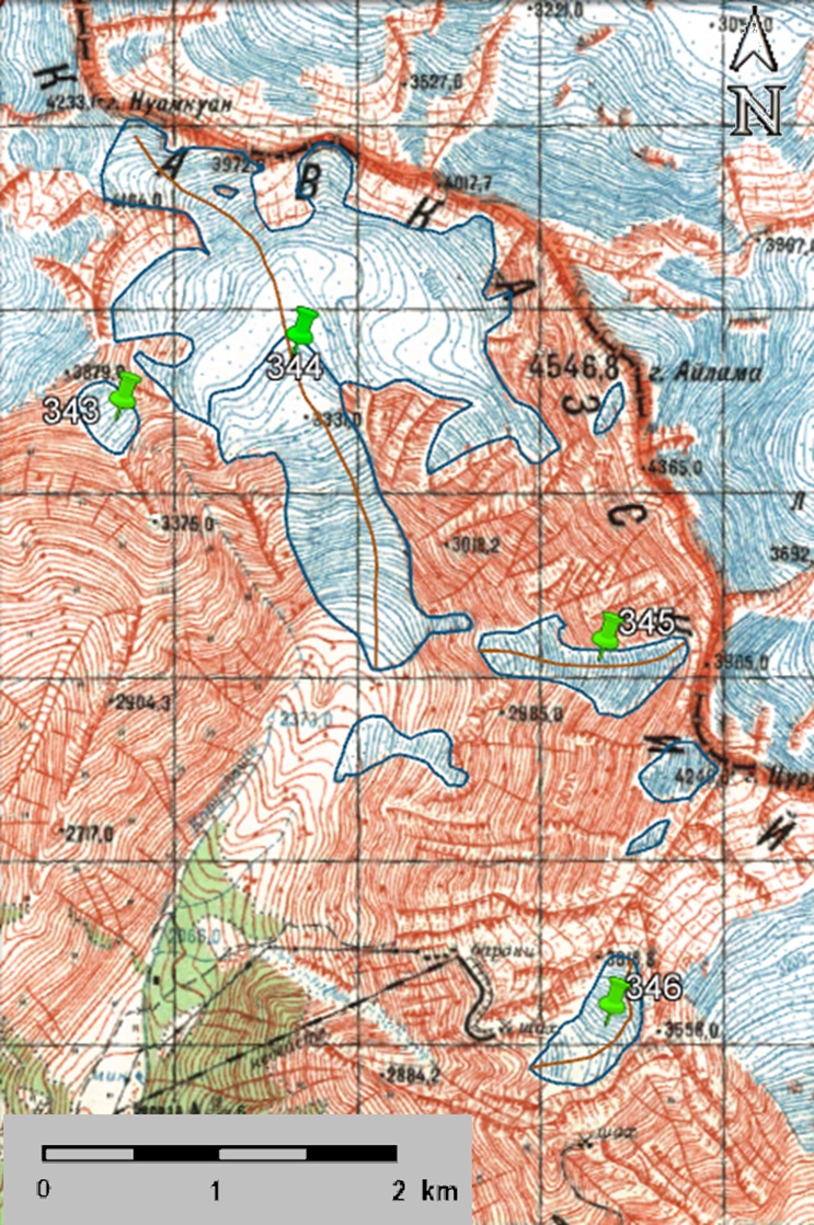 Fig. 7. Contours of glaciers No. 343, No. 344 (Koruldashi) − 346: a − according to the topographic map, b − according to the Landsat 5 TM sensor image of August 11, 2011, c − according to the Landsat 8 OLI TIRS sensor image of September 12, 2017, d − according to the Landsat 8 OLI TIRS sensor image of September 11, 2020.
