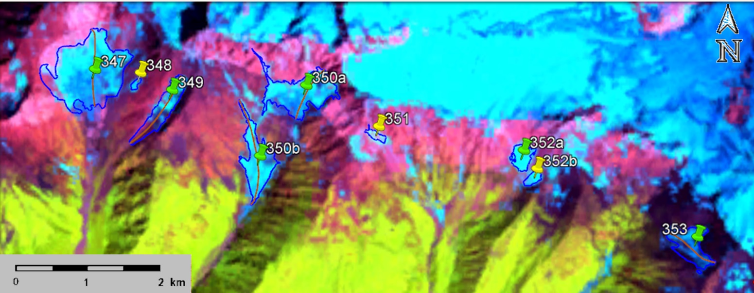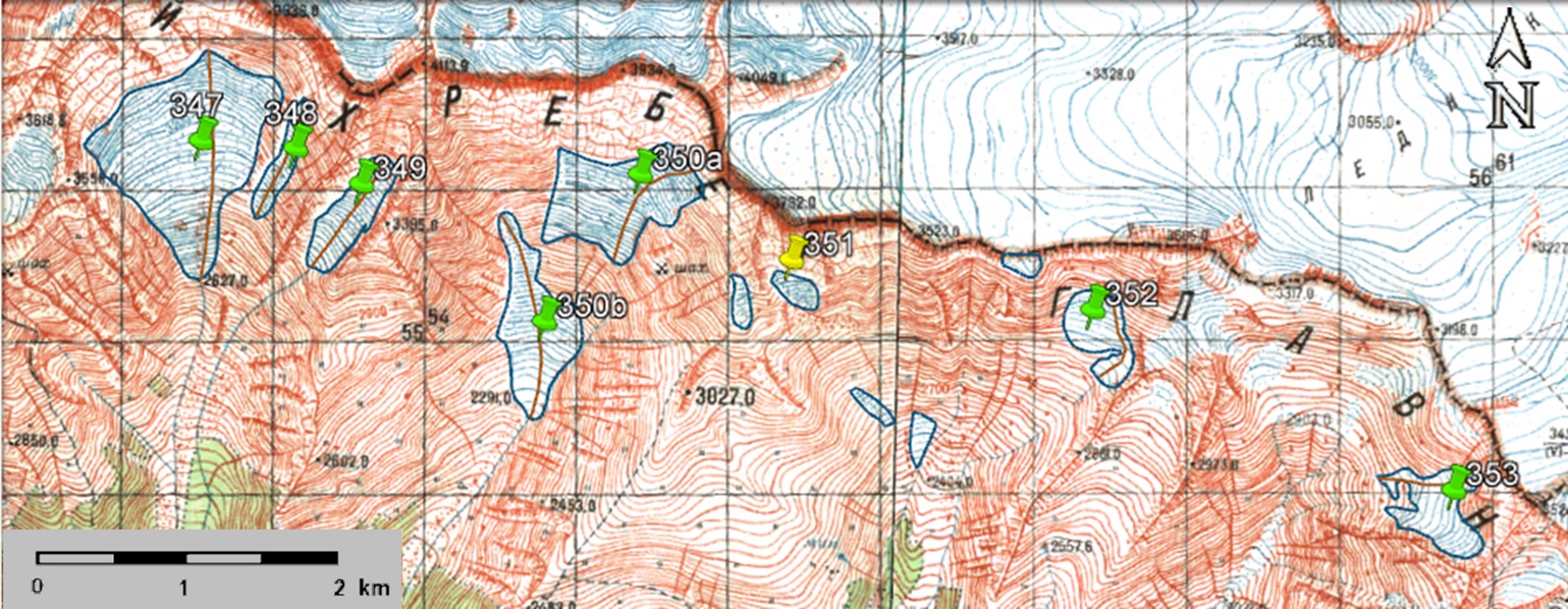 Fig. 8. Contours of glaciers No. 347 (Tsurungala), No. 348, No. 349 (Chorokhi) − 353 (Zeskho): a − according to the topographic map, b − according to the Landsat 5 TM sensor image of September 19, 2011, c − according to the Landsat 8 OLI TIRS sensor image of September 12, 2017, d − according to the Landsat 8 OLI TIRS sensor image of September 11, 2020.