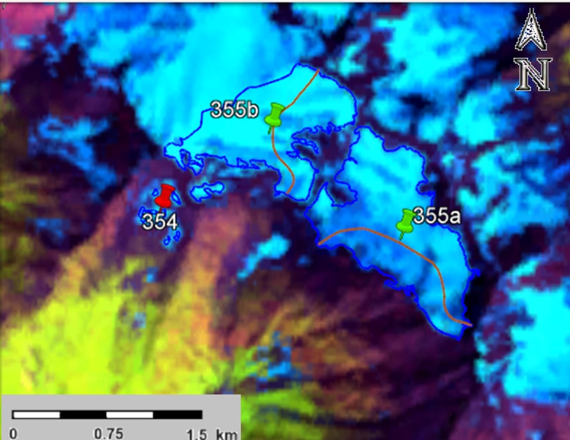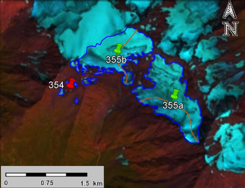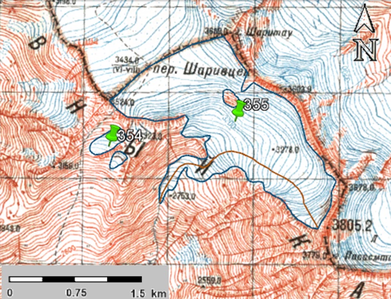 Fig. 9. Contours of glaciers No. 354 and No. 355 (Sharivtseki): a − according to the topographic map, b − according to the Landsat 5 TM sensor image of August 11, 2011, c − according to the Landsat 8 OLI TIRS sensor image of September 12, 2017, d − according to the Landsat 8 OLI TIRS sensor image of September 11, 2020.