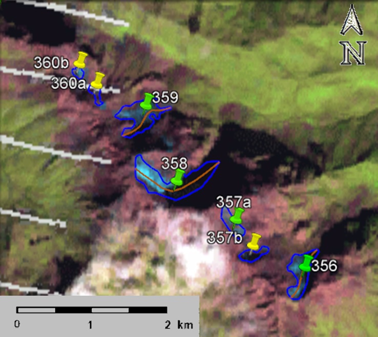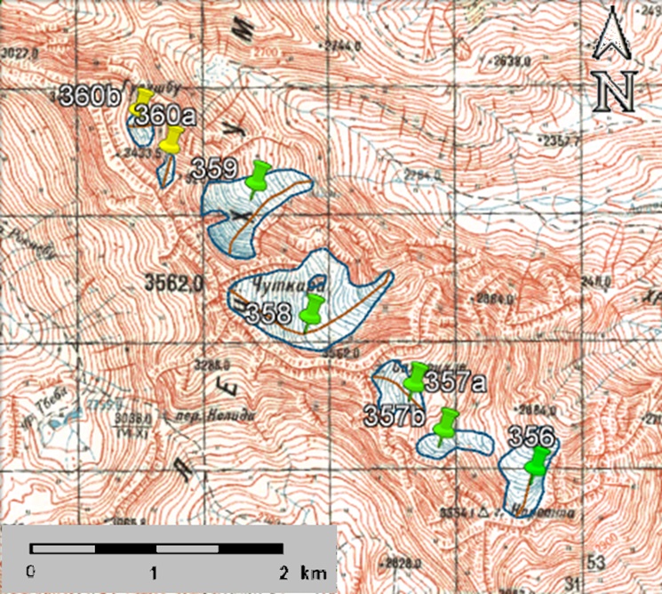 Fig. 10. Contours of glaciers No. 356 (Careta), No. 357 (Samertskhle), No. 358 (East Chutkara), No. 359 (Chutkara) and No. 360 (Latashuri): a − according to the topographic map, b − according to the Landsat 7 ETM+ sensor image of September 20, 2011, c − according to the Landsat 8 OLI TIRS sensor image of September 12, 2017, d − according to the Landsat 8 OLI TIRS sensor image of September 24, 2022.