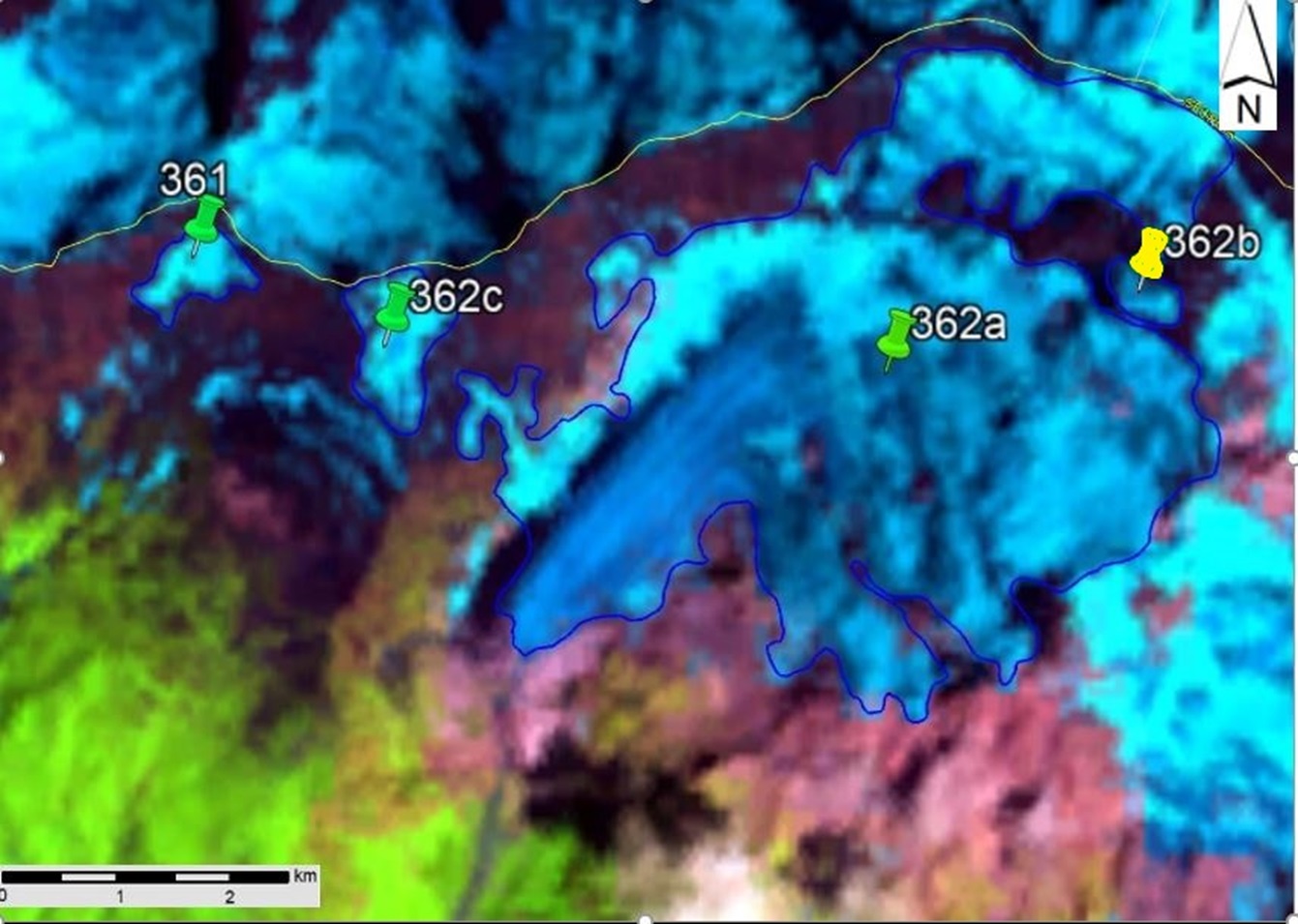 Fig. 11. Contours of glaciers No. 361 and No. 362 (Edena): a − according to the topographic map, b − according to the Landsat 7 ETM+ sensor image of August 31, 2010, c − according to the Landsat 8 OLI TIRS sensor image of September 5, 2015, d − according to the Landsat image of September 11, 2020.