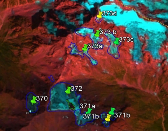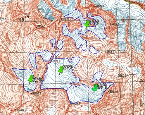 Fig. 15. Contours of glaciers No. 370 − 373: a − according to the topographic map, b− according to the Landsat 7 ETM+ sensor image of August 31, 2010, c − according to the Landsat 8 OLI TIRS sensor image of September 5, 2015, d − according to the Landsat 8 OLI TIRS sensor image of September 11, 2020.