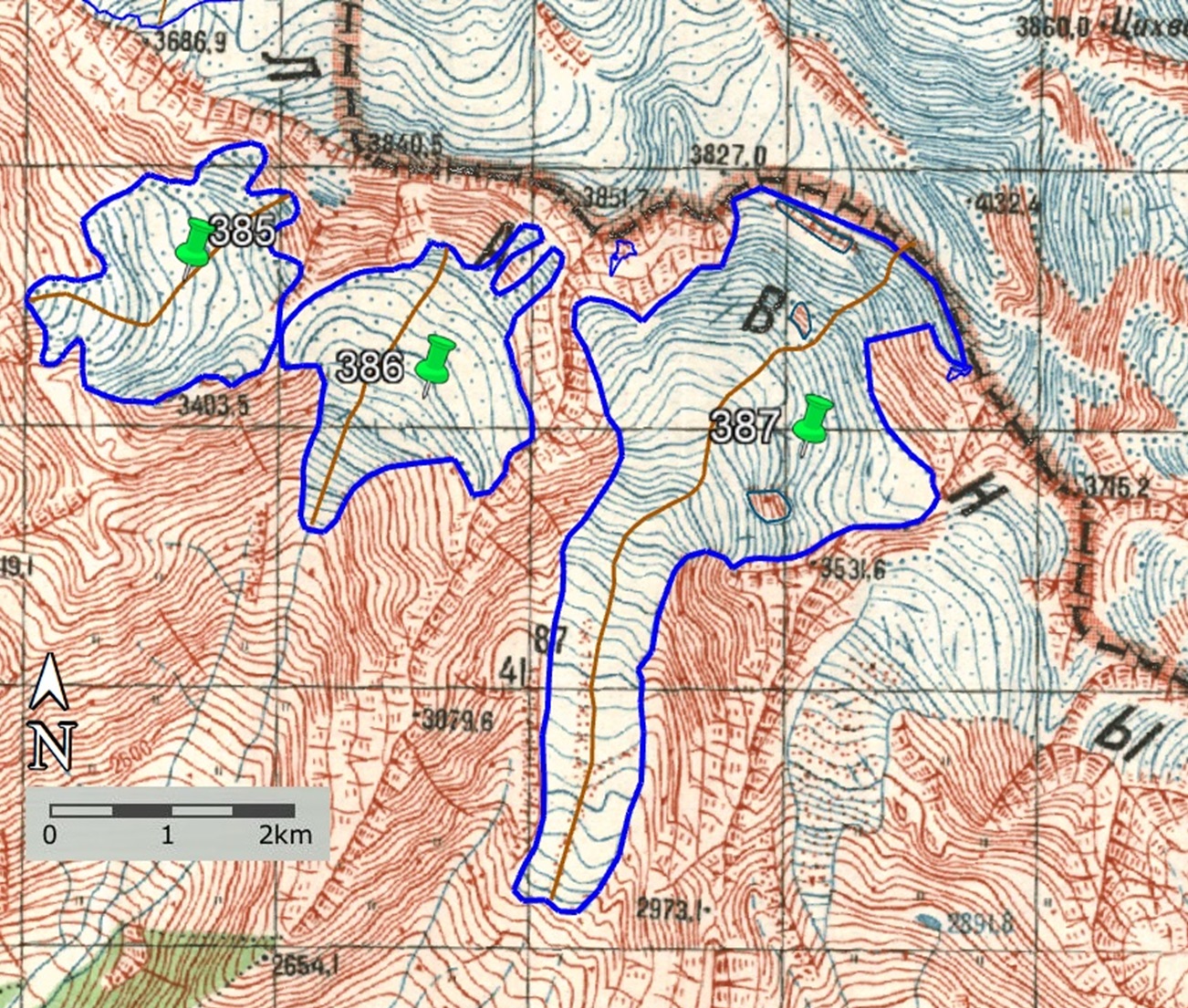 Fig. 20. Contours of glaciers No. 385 (Kodnarula), No. 386 (Shtakho) and No. 387 (Khvakhrula): a − according to the topographic map, b − according to the Landsat 7 ETM+ sensor image of August 11, 2011, c − according to the Landsat 8 OLI TIRS sensor image of September 12, 2017, d − according to the Landsat 8 OLI TIRS sensor image of September 4, 2020.