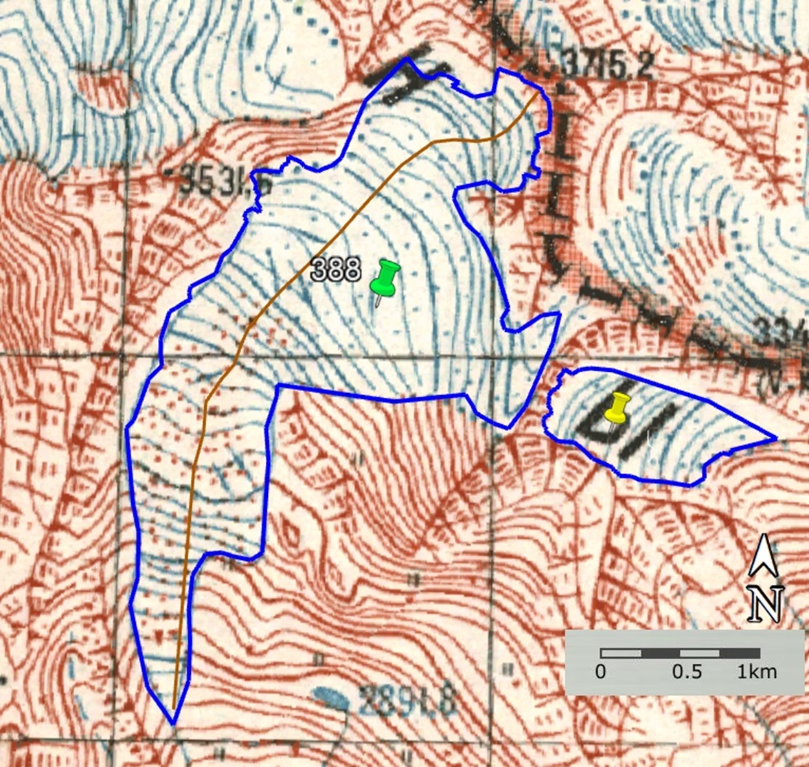 Fig. 21. Contours of Glacier Basin No. 388 and the unrecorded glaciers: a − according to the topographic map, b − according to the Landsat 7 ETM+ sensor image of August 11, 2011, c − according to the Landsat 8 OLI sensor image of September 12, 2017, d − according to the Landsat 8 OLI TIRS sensor image of September 4, 2020.