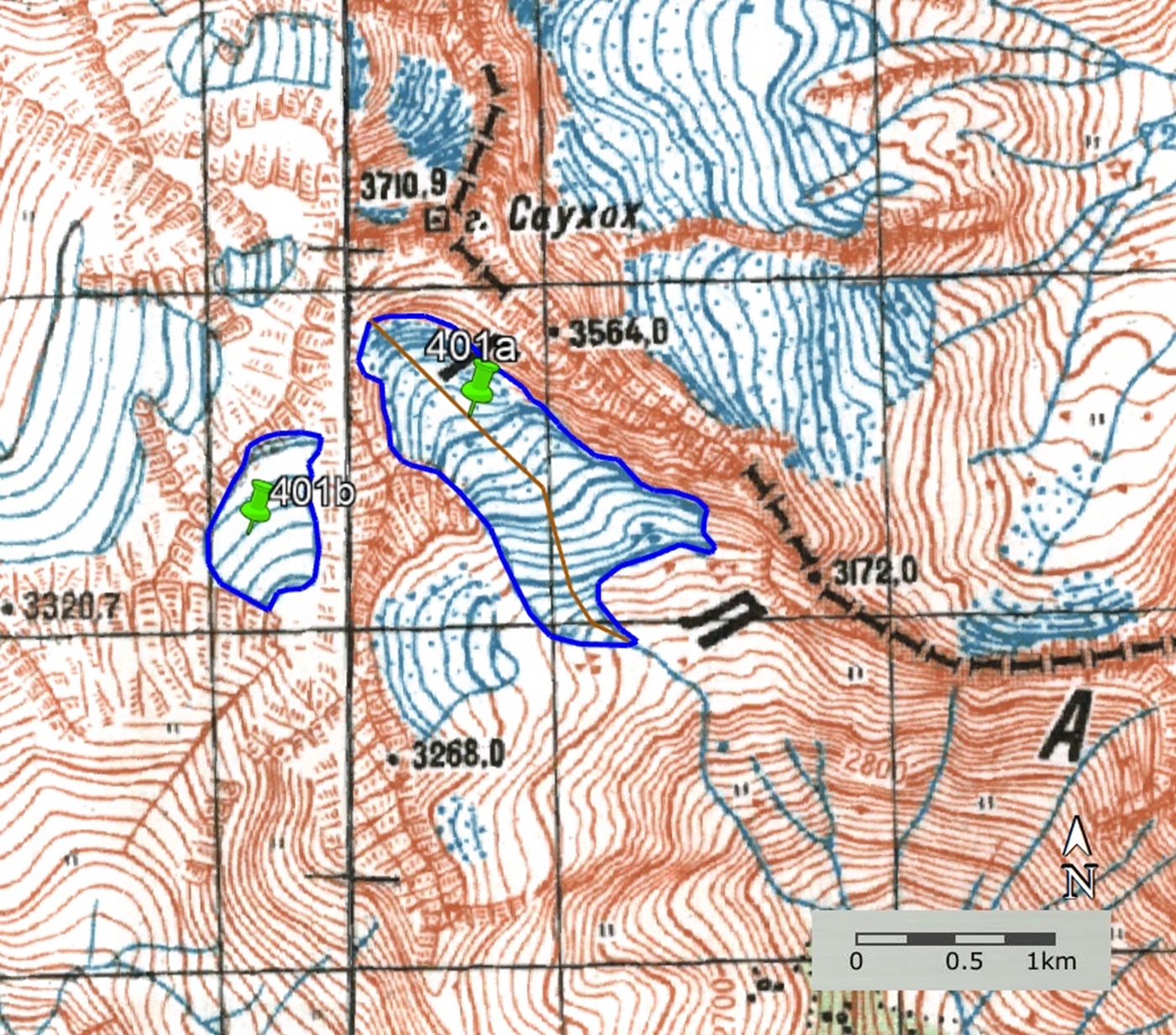 Fig. 28. Contours of the Jejora River No. 401 (Saukhokhi) Glacier: a − according to the topographic map, b − according to the Landsat 7 ETM+ sensor image of August 11, 2011, c − according to the Landsat 8 OLI sensor image of September 12, 2017, d − according to the Landsat 8 OLI TIRS sensor image of September 4, 2020.