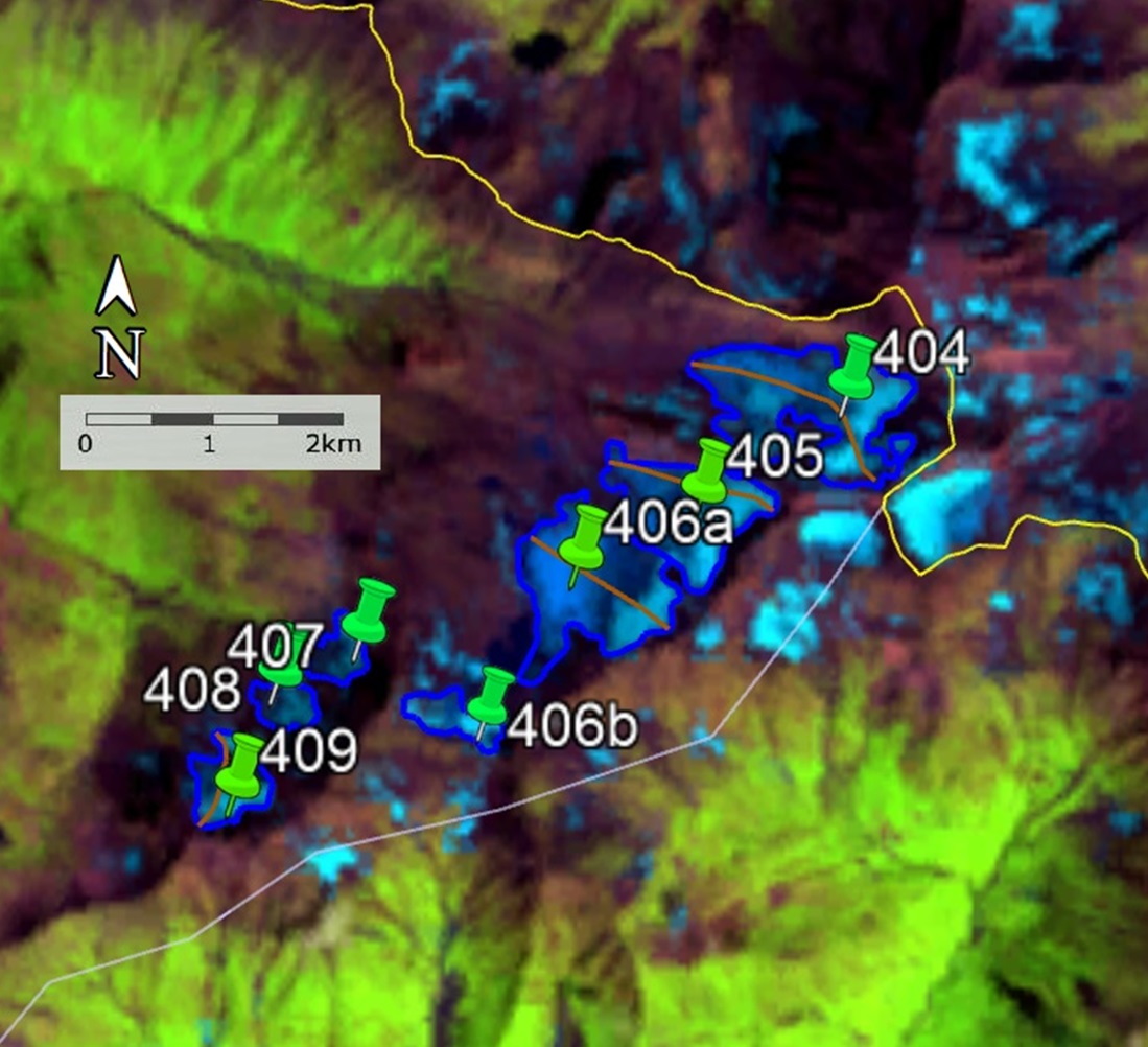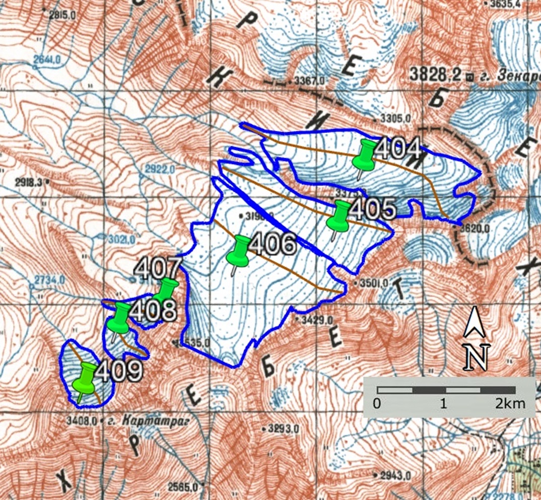 Fig. 30. Contours of glaciers No. 404 − 409: a − according to the topographic map, b − according to the Landsat 7 ETM+ sensor image of August 11, 2011, c − according to the Landsat 8 OLI sensor image of August 28, 2014, d − according to the Landsat 8 OLI TIRS sensor image of September 4, 2020.
