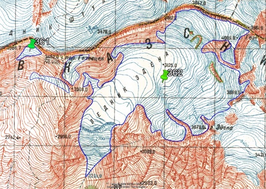 სურ. 11. №361 და №362 (ედენა) მყინვარების კონტურები: ა − ტოპოგრაფიული რუკის მიხედვით, ბ − Landsat 7 ETM+ სენსორის 2010 წლის 31 აგვისტოს სურათის მიხედვით, გ − Landsat 8 OLI TIRS სენსორის 2015 წლის 5 სექტემბრის სურათის მიხედვით, დ − Landsat-ის 2020 წლის 11 სექტემბრის სურათის მიხედვით.