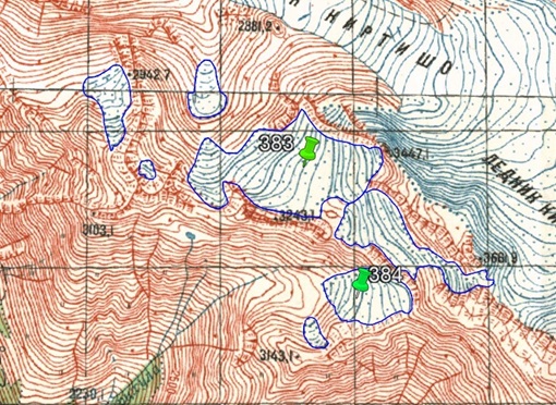 სურ. 19. №383 და №384 მყინვარების კონტურები: ა − ტოპოგრაფიული რუკის მიხედვით, ბ − Landsat 7 ETM+ სენსორის 2010 წლის 31 აგვისტოს სურათის მიხედვით, გ − Landsat 8 OLI TIRS სენსორის 2015 წლის 5 სექტემბრის სურათის მიხედვით, დ − Landsat 8 OLI TIRS სენსორის 2020 წლის 11 სექტემბრის სურათის მიხედვით.