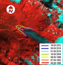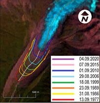 Boko Glacier: a − Schematic image of retreat; b − Retreat graph.