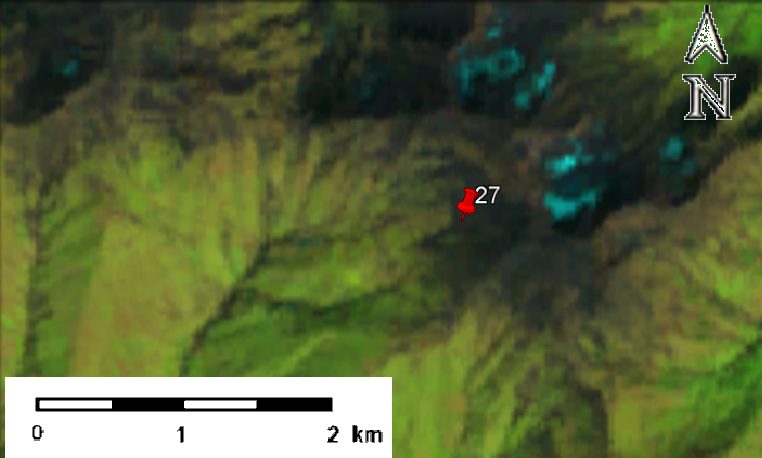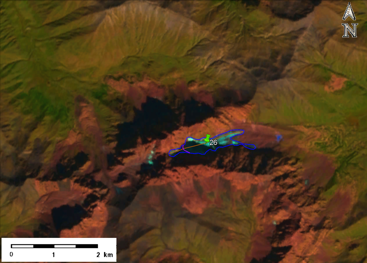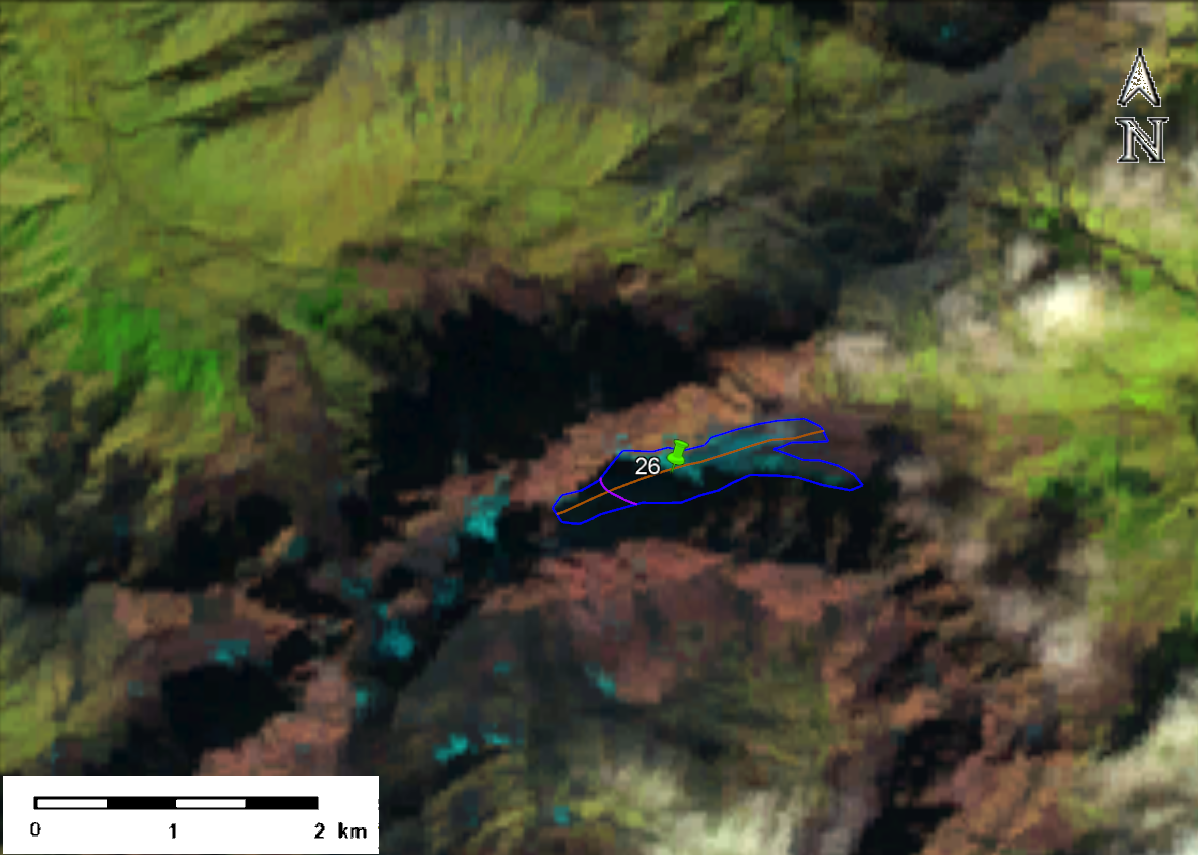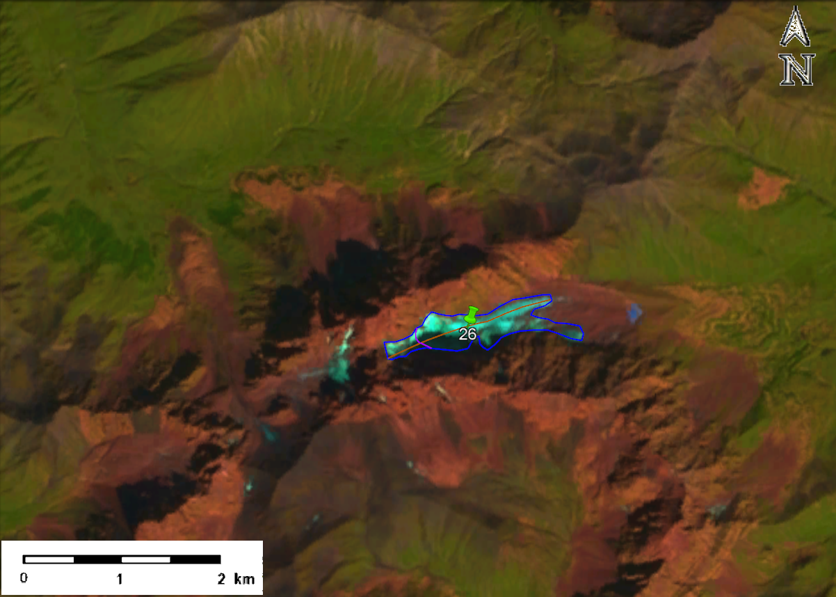 სურ. 4. №26 (აბუდელაური) მყინვარის კონტური: ა – ტოპოგრაფიული რუკის მიხედვით, ბ – Landsat 5 TM სენსორის 2011 წლის 21 სექტემბრის სურათის მიხედვით, გ – Landsat 8 OLI TIRS სენსორის 2014 წლის 28 აგვისტოს სურათის მიხედვით, დ – Landsat 8 OLI TIRS სენსორის 2020 წლის 13 სექტემბრის სურათის მიხედვით.