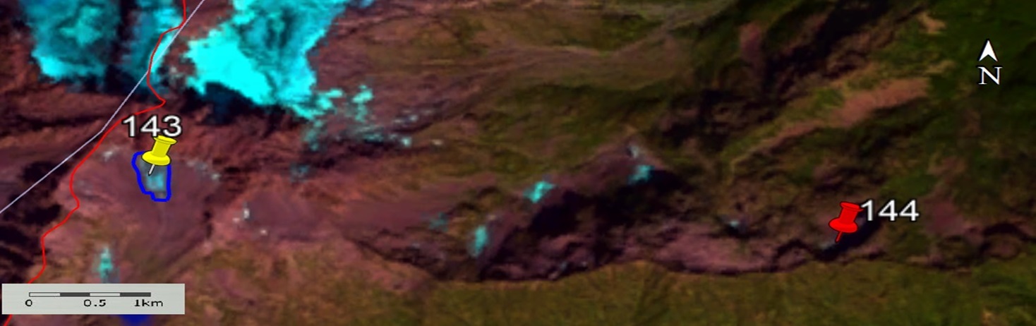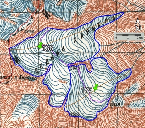 სურ. 1. №137 (ხარიხარა, 143a) და №138 (ხარიხარა, 143b) მყინვარების კონტურები: ა − ტოპოგრაფიული რუკის მიხედვით, ბ − Landsat 7 ETM+ სენსორის 2010 წლის 31 აგვისტოს სურათის მიხედვით, გ − Landsat 8 OLI TIRS სენსორის 2017 წლის 19 სექტემბრის სურათის მიხედვით, დ − Landsat 8 OLI TIRS სენსორის 2020 წლის 11 სექტემბრის სურათის მიხედვით.